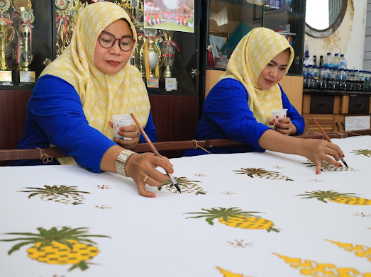 PEKANBARU – Dua wanita itu piawai melukiskan canting di atas kain putih. Jemari mereka lentur mengikuti garis dan pola yang menawan. Seketika kain putih yang dibentang dengan bingkai lima meter persegi itu berubah menjadi kain batik yang cantik, lengkap dengan ornamen khas tanah Melayu.
