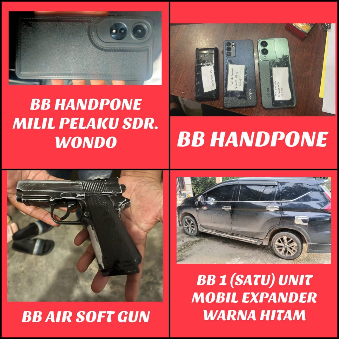 Dengan barang bukti, 1 Unit Senjata Jenis Air Soft Gun milik pelaku Wondo. 1 Unit Mobil Expander Warna Hitam. 1 Unit Handphone Merk Vivo milik Markus,