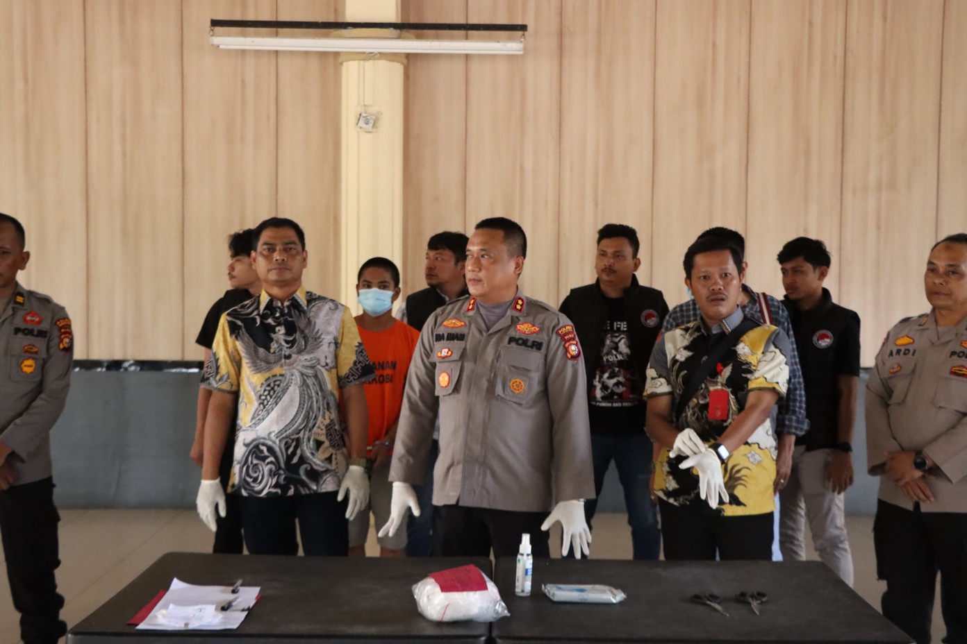 Kapolres Rohil, didampingi Kasat Narkoba Polres Rohil AKP Sodikin, SH, Kasat Tahti Iptu J Gultom,SH. Kasiwas, AKP Juliandi, SH. KBO, Satnarkoba Ipda Anta Arif Siregar,SH, Kasi Humas Polres Rohil Ipda Dahri Iskandar Lubis, Kajari Rohil diwakili Daniel Sitorus, Kuasa hukum tersangka, M. Salin, SH. Dua tersangka pelaku, beserta beberapa awak media.