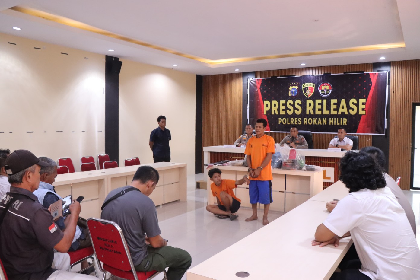 Didampingi Kasat Reskrim Polres Rohil AKP I Putu Adi Juniwinata, S.Tr. K. S.I.K. M. Si, Kapolsek Pujud AKP Boy Setiawan S.A.P. M.Si. Dengan menghadirkan dua tersangka pelaku dan satu pelaku tidak dihadirkan karena masih dibawah umur, Kepada awak media Kapolres Rohil AKBP Isa Imam Syahroni mengidentifikasi nama nama pelaku yang tidak lain adalah ayah dan 2 anak laki-lakinya.
