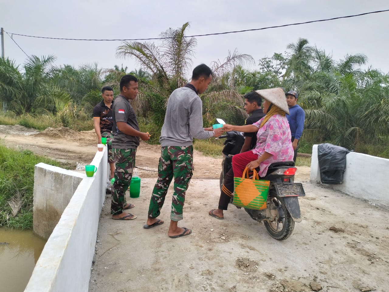 Di atas jembatan di pinggir lokasi proyek, prajurit dan warga yang turut membantu pekerjaan konstruksi duduk bersama, menikmati makanan ringan sambil berbincang akrab, ditemani aroma kopi yang menambah hangat suasana.
