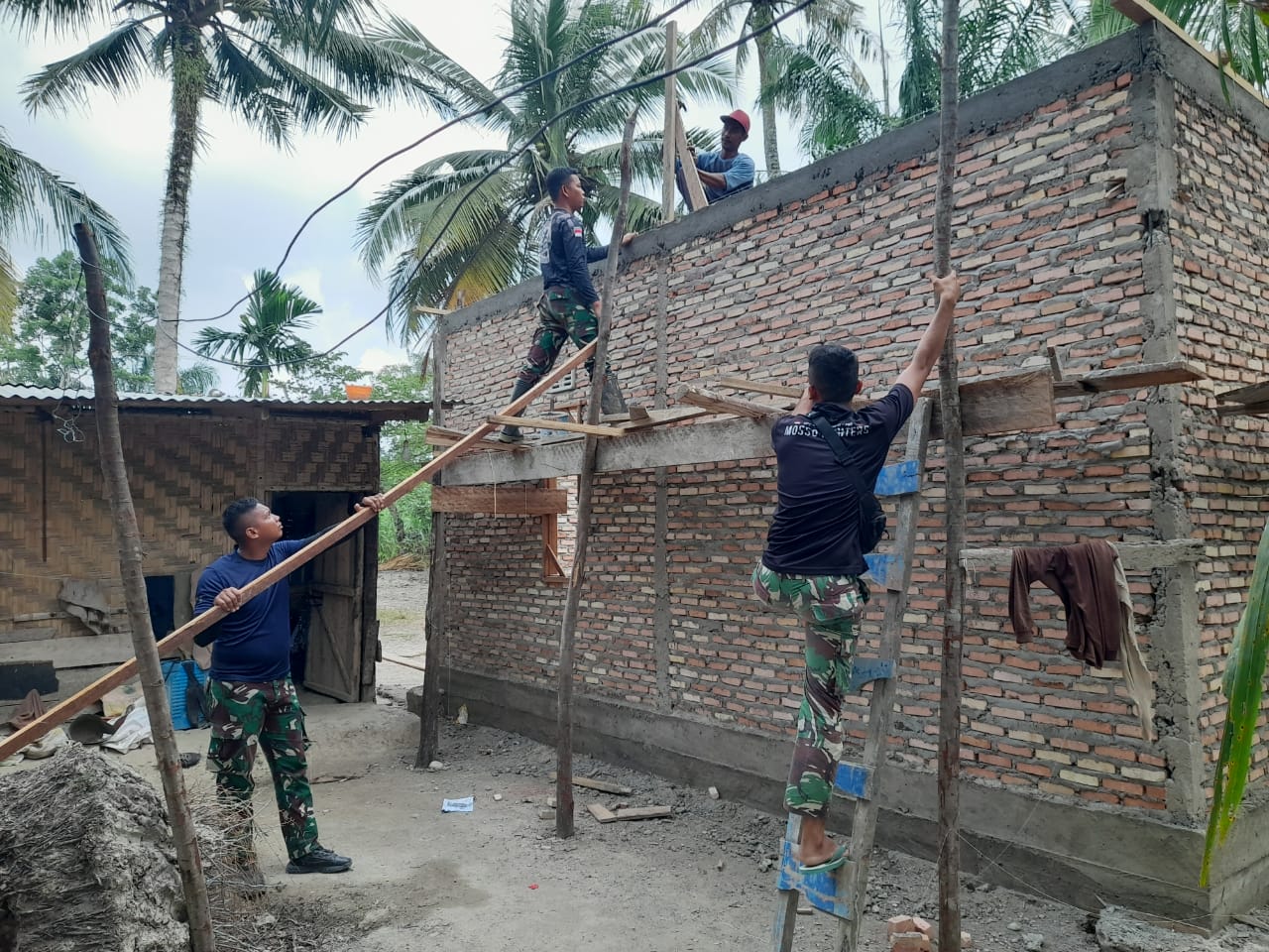 Pagi ini, di bawah langit cerah Pekaitan, anggota Satgas TMMD bekerja dengan penuh dedikasi, dibantu oleh warga sekitar yang secara sukarela ikut mengangkut material, membongkar balok lama, memasang kayu atap, dan mencampur adonan semen.