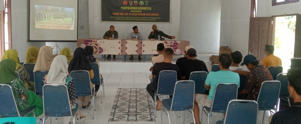 ROKAN HILIR – Rangkaian program TNI Manunggal Membangun Desa (TMMD) ke-125 Kodim 0321/Rohil, melakukan kegiatan penyuluhan pencegahan Kebakaran Hutan dan Lahan (Karhutla) yang digelar di Aula Kantor Penghulu Suak Temenggung, Kecamatan Pekaitan, Kabupaten Rohil, Selasa, (5/8/2025).