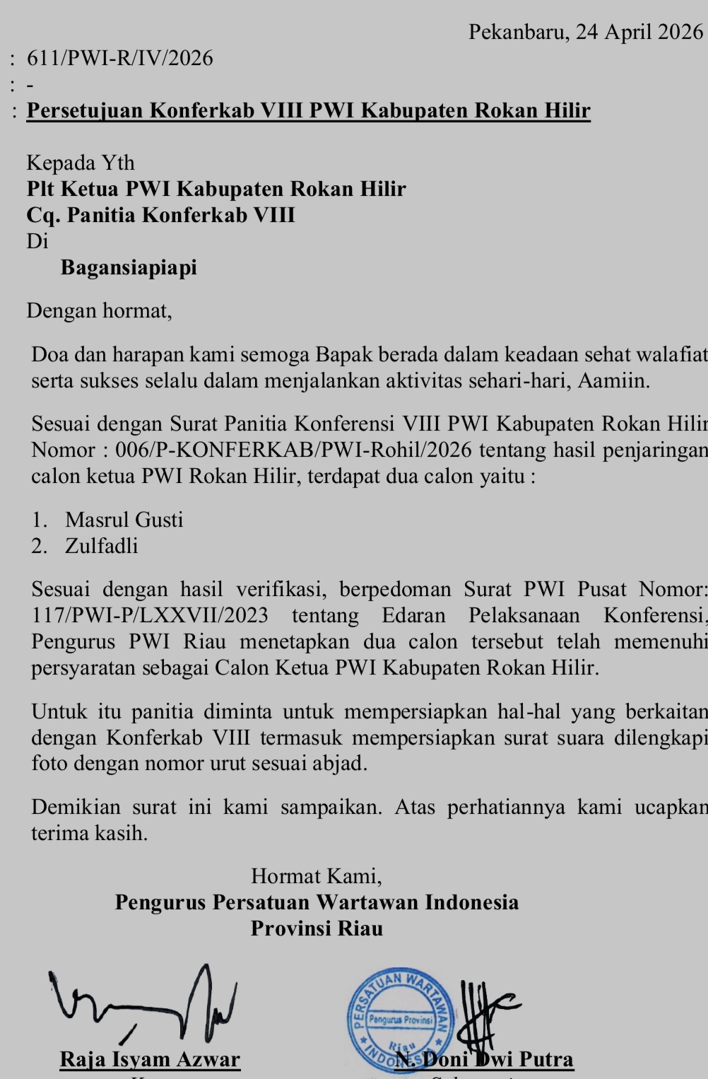 ” Dokumen para bacalon yang masuk telah diperiksa dan diverifikasi, hasilnya keduanya dinyatakan sah sebagai Calon untuk maju pada konferkab VIII PWI Rohil 2026 ini ,” kata Sutrisno, Sabtu (25/4/26) di Bagansiapiapi.